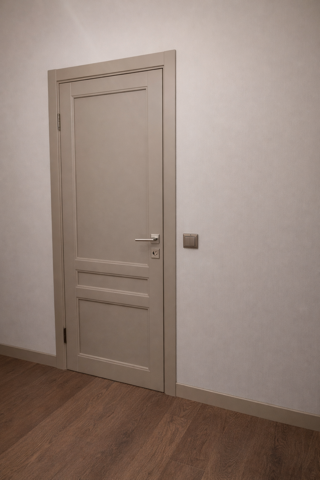 Оттенок — тёплый серо-бежевый, близкий к капучино. Он мягко смотрится в интерьере, не уходит в холодный серый и отлично сочетается как с деревянными полами, так и с плиткой или керамогранитом. В зависимости от фурнитуры дверь может выглядеть по-разному: с хромом — спокойно и сдержанно, с чёрной ручкой — более современно и контрастно.