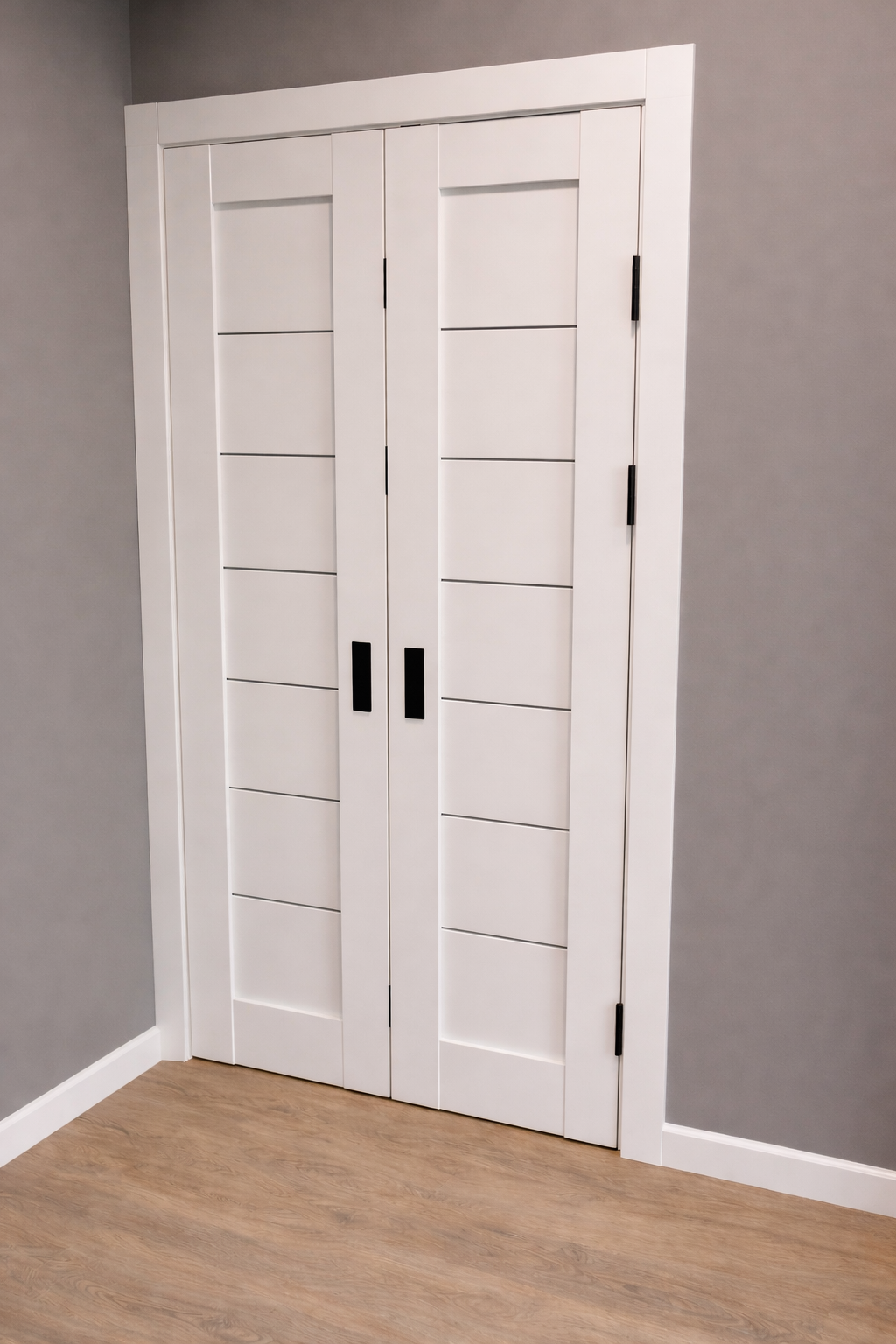 Современное решение для помещений, где важно сохранить каждый сантиметр пространства. Дверь-книжка складывается, занимая минимум места при открывании — отличный вариант для гардеробных, кладовых, ниш, небольших комнат и узких коридоров, где установка обычной распашной двери затруднена.